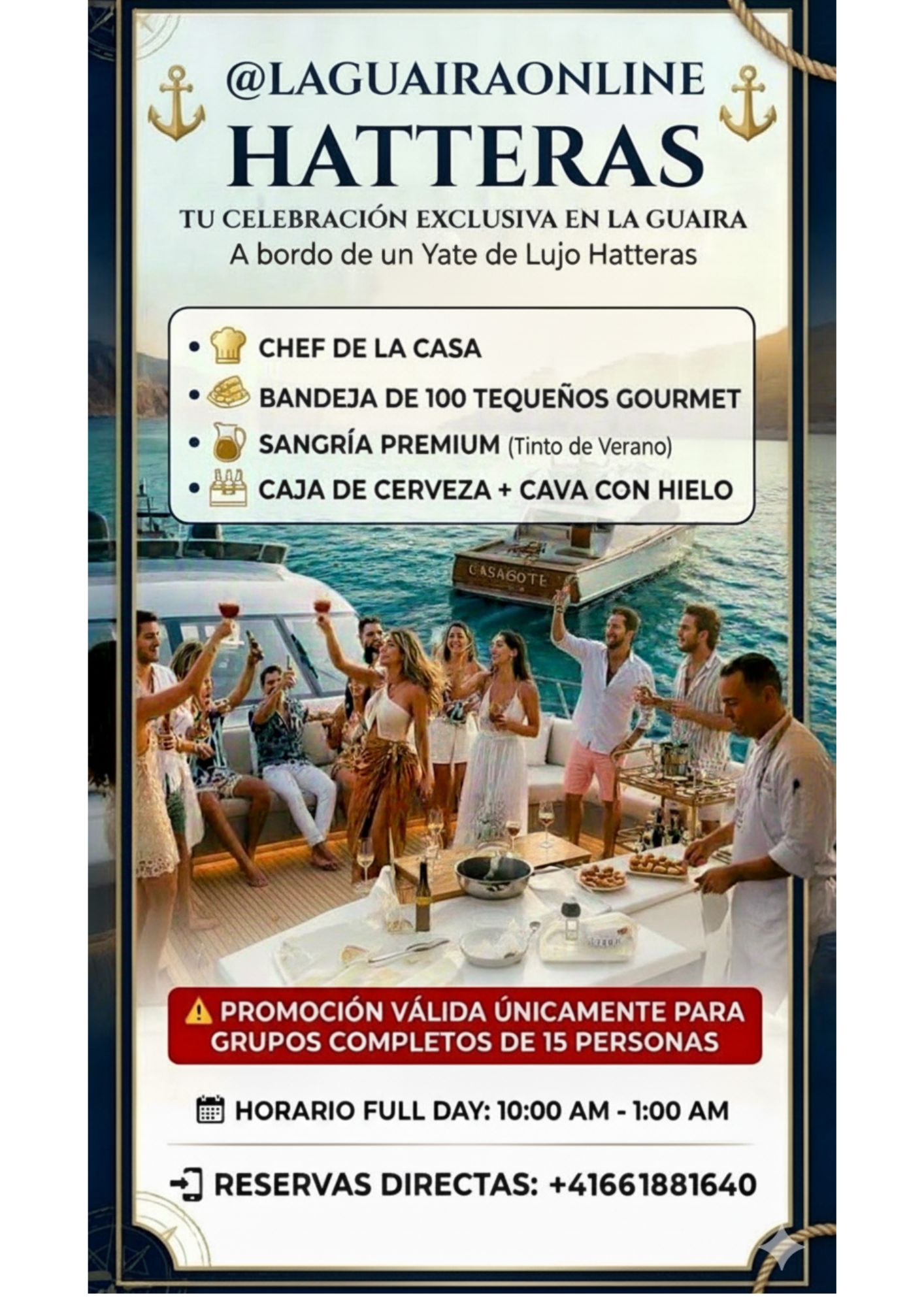 Disfruta junto con tus amigos o familiares de tu evento preferido hasta 15 personas a bordo a nuestro yate en modalidad muelle donde podrás disfrutar de la música, de bañarte en el mar , de contar con nuestro chef que te apoyará en todas las logística de comida si necesitas, todo lo referente a la seguridad y las instalaciones con total tranquilidad